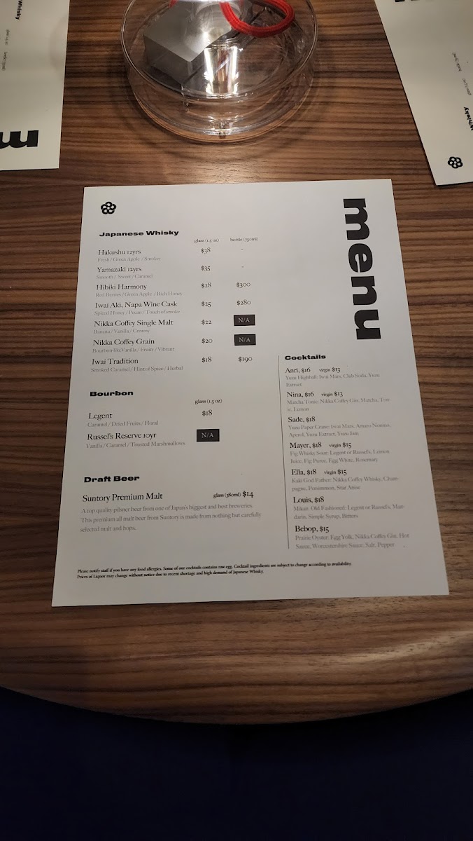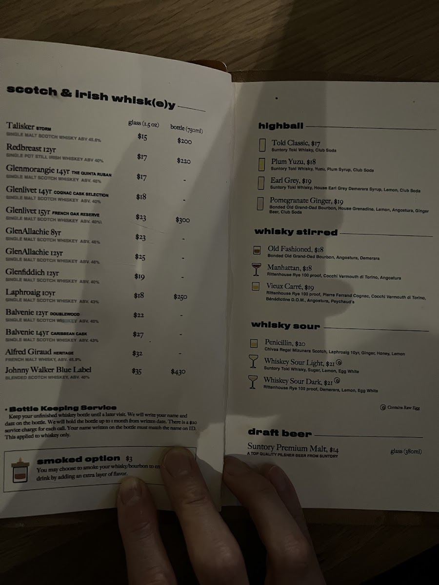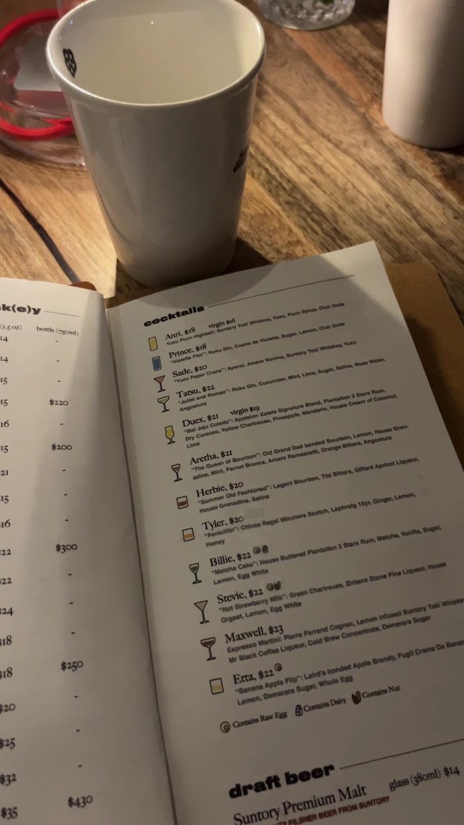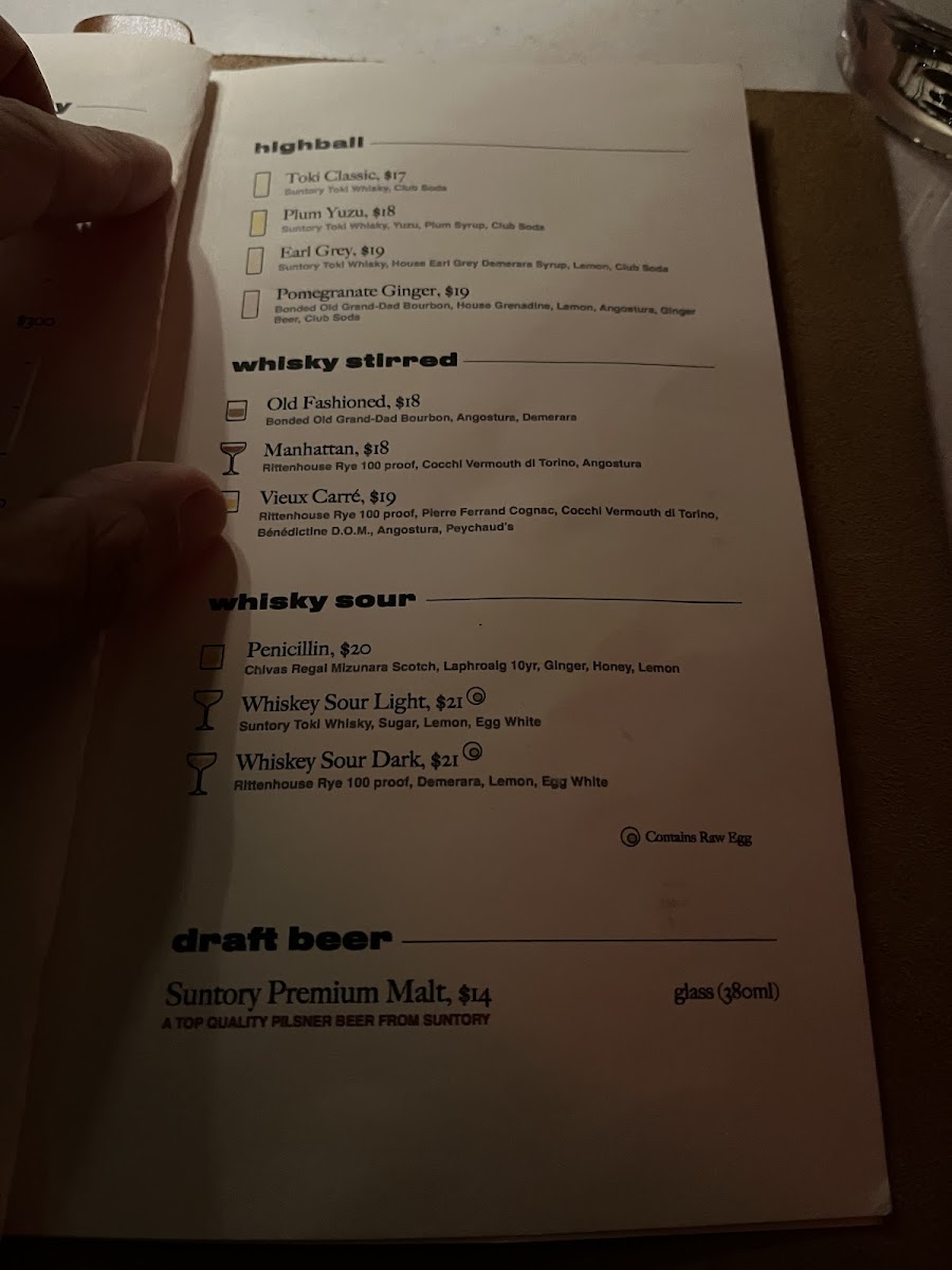The drink selection complements this relaxed yet vibrant atmosphere with classic cocktails and whiskey-based creations like the Whiskey Sour and Plum Yuzu Highball, alongside refreshing options such as iced tea and draft Suntory Premium Malt beer. These beverages pair well with the food and fit naturally into the speakeasy-style setting, making it a great spot for unwinding after work or gathering with friends.